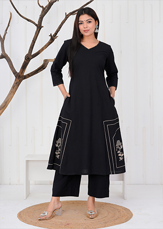 A-Line Flex Cotton Coordset with artisan threadwork & pockets on both sides of Kurti. Kurti Length:46' , Bottom Length:36'