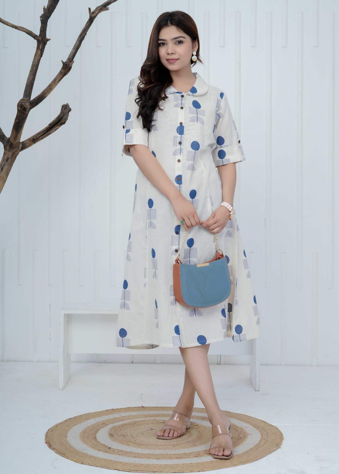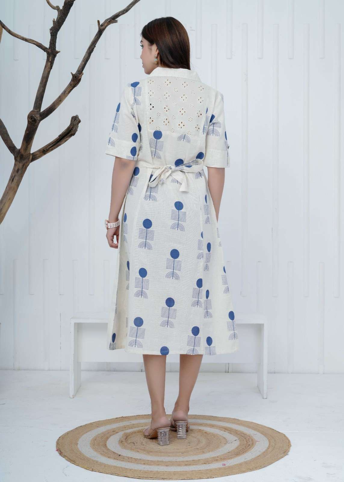 The Geometric Muse Dress is designed in khadi cotton and highlighted with intricate sifli work on the back, paired with a modern abstract geometric print. An adjustable waist belt allows customized fitting while adding structure to the silhouette. Featuring a 43" length, this dress delivers a perfect balance of comfort and contemporary style.